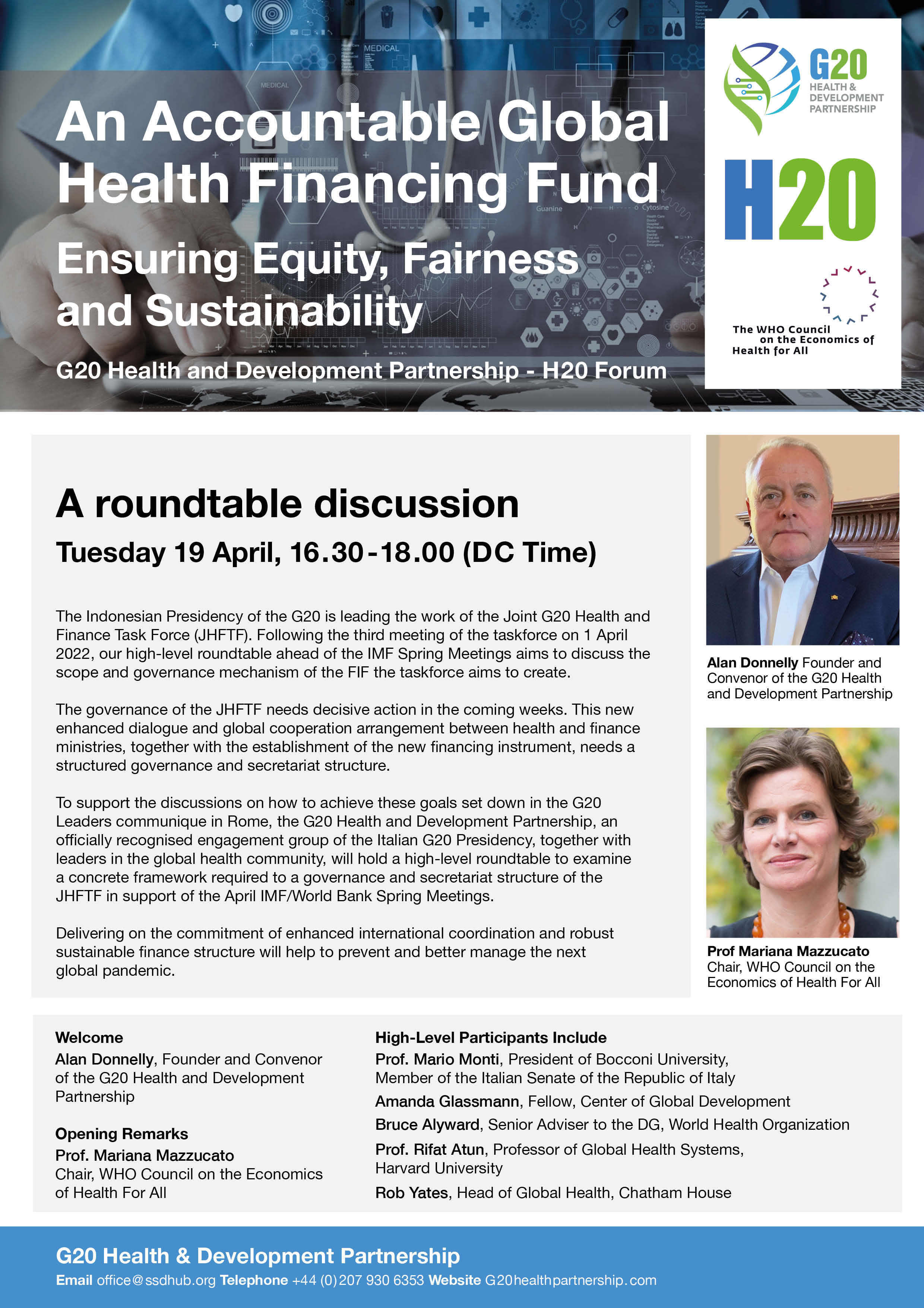 “We establish a G20 Joint Finance-Health Task Force aimed at enhancing dialogue and global cooperation on issues relating to pandemic PPR, promoting the exchange of experiences and best practices, developing coordination arrangements between Finance and Health Ministries, promoting collective action, assessing and addressing health emergencies with cross-border impact, and encouraging effective stewardship of resources for pandemic preparedness and response (PPR), while adopting a One Health approach. Within this context, this Task Force will work, and report back by early 2022, on modalities to establish a financial facility, to be designed inclusively with the central coordination role of the WHO, G20-driven and engaging from the outset Low- and Middle-Income Countries, additional non-G20 partners and Multilateral Development Banks, to ensure adequate and sustained financing for pandemic prevention, preparedness and response.“ (G20 Leaders communique – Rome 31st October 2021)